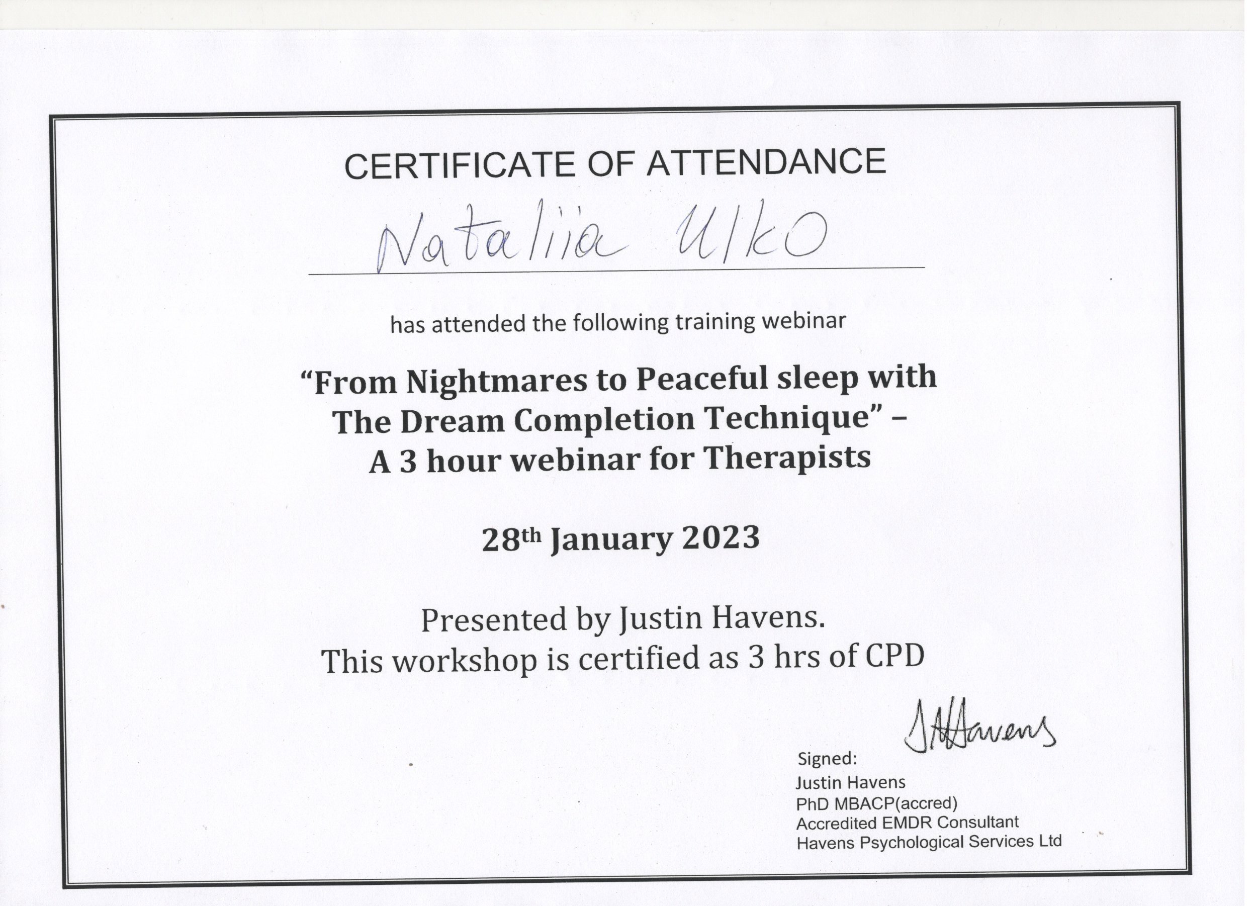 Сертифікат про підвищення кваліфікації "Посттравматичний стрес: дорослі, діти та батьківщини у ситуації війни" (Міжнародна міждисциплінарна асамблея, Київ, 2017 р.)