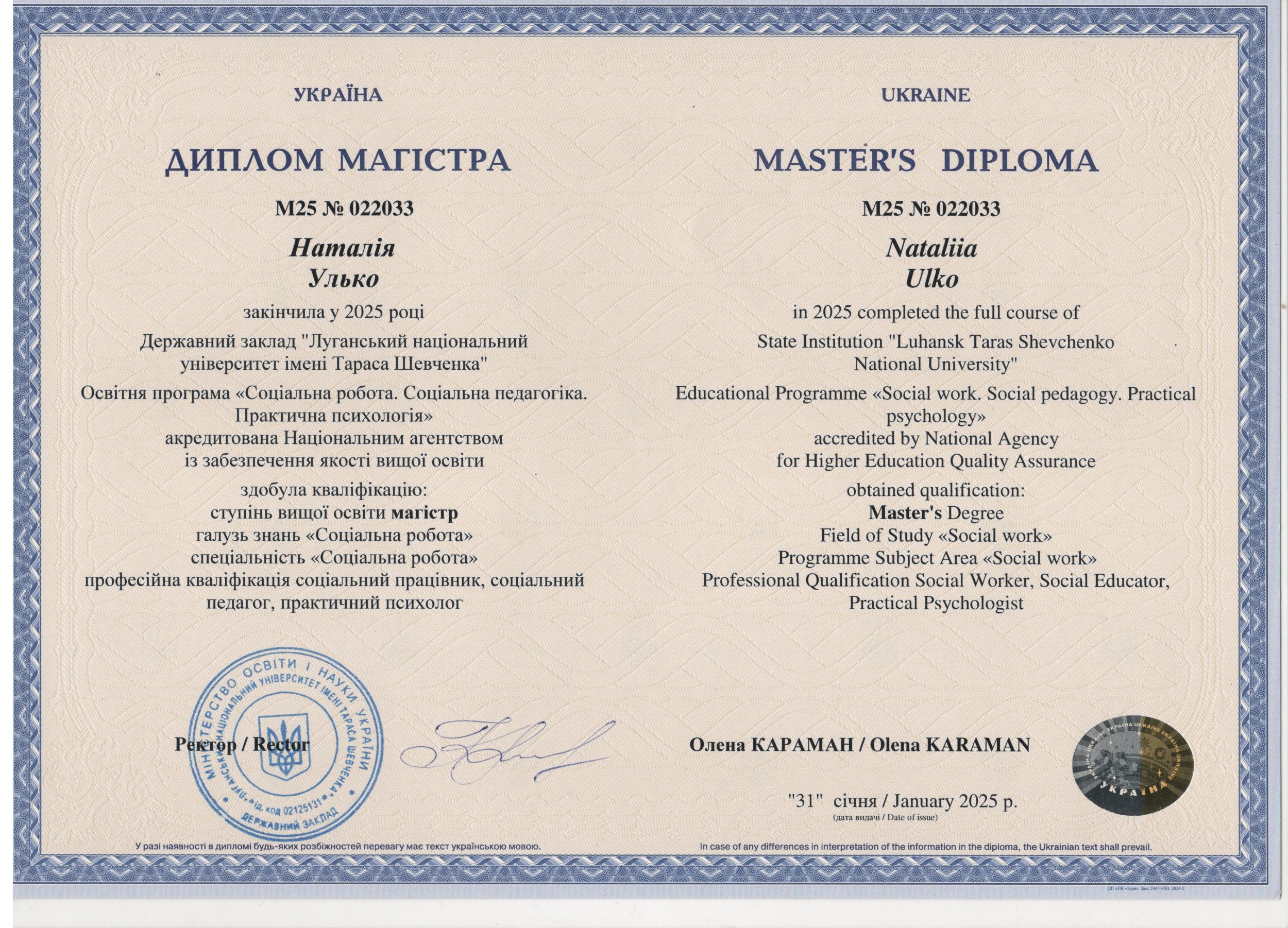 Сертифікований спеціаліст з програми European School Psychology Centre for Training – “Професійна освіта в школі та комунікації в Israeli” (Ізраїль, 2014 р.)