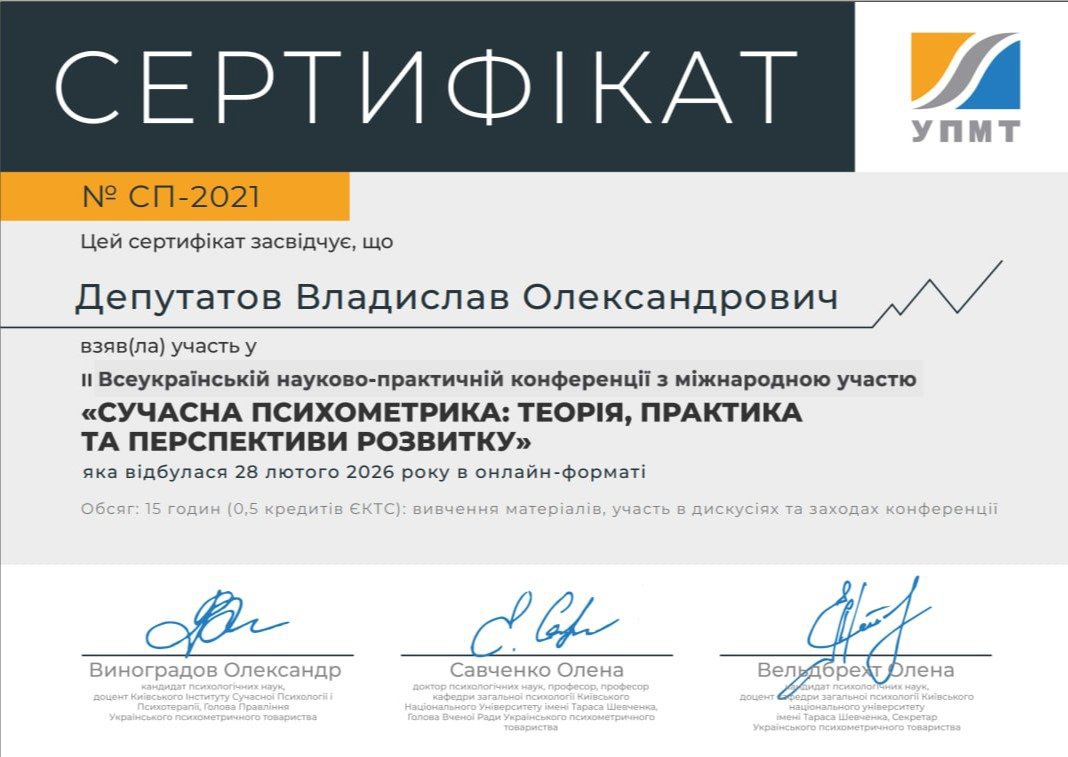 учасника Всеукраїнської (з міжнародною участю) науково-практичної конференції студентів, аспірантів та молодих вчених «Соціально-психологічні технології розвитку особистості»