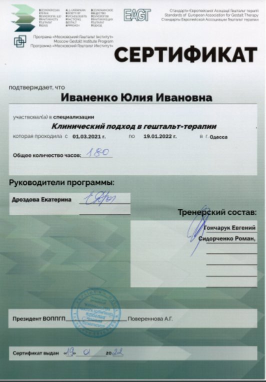 Працюю під супервізією, дотримуюся конфіденційності та шаную етичний кодекс професії.